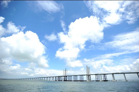 青島海灣大橋,東起青島主城區(qū)308國道楊家群入口處,跨越膠州灣海域,西至黃島紅石崖,(一期工程)路線全長新建里程28.047 公里, (二期工程12公里。)其中海上段長度 25.171 公里,青島側(cè)接線 749 米 、黃島側(cè)接線 827.021 米 、紅島連接線長 1.3 公里。主線橋?qū)?5米,雙向六車道,設(shè)計行車速度 80 公里 / 小時,工程概算投資 90.4 億元。 預(yù)計將于2011 年建成。